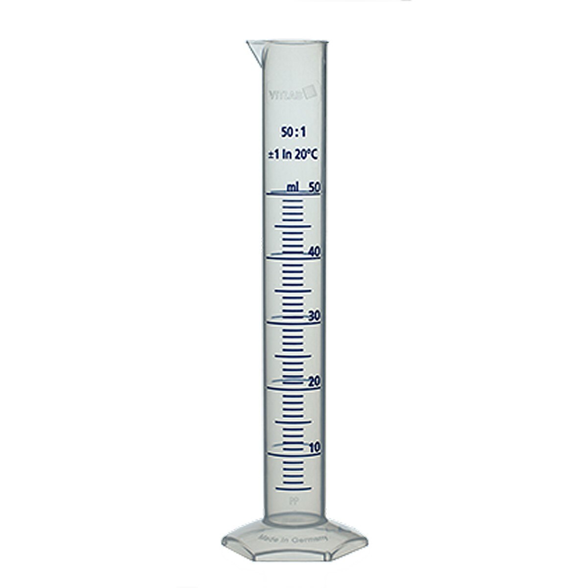 Highly transparent. With easily readable, molded, embossed blue graduations and ring marks at the primary scale points. Calibrated ‘In’. Class B tolerances according to DIN 12681 / ISO 6706. Hexagonal base with bottom studs provides high stability. Thermal stress up to 80 °C does not cause tolerance limits to be permanently exceeded. To preserve markings. do not clean at temperatures exceeding 60 °C.