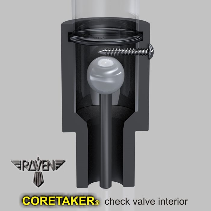 Raven’s CNC machined automatic check valve with internal O-ring is larger than other brand’s molded valves. Our check valve has a larger annulus for greater flow through and our ball stop also functions as the fastener for the valve to the clear polycarbonate tube. Drips from the valve are a thing of the past with CORETAKER’S® Hydro-Lock seal. Fewer parts and greater flow through makes good sense.