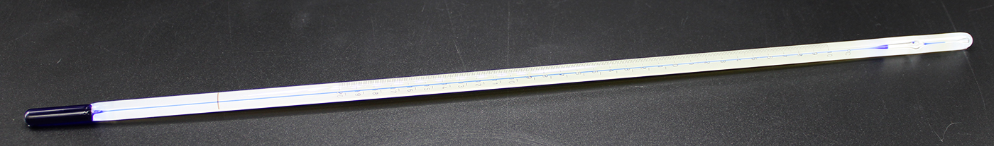 370 mm-long non-mercury blue-liquid ASTM thermometer with -20 to 10°C range and 0.1°C divisions