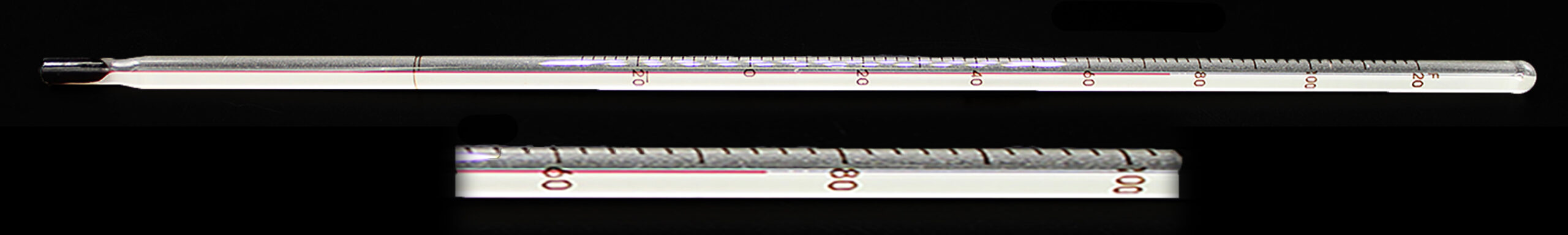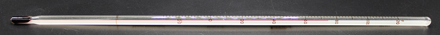 305 mm-long general-lab red-liquid thermometer for 76 mm immersion with -30 to 120°F range in 1.0°F increments